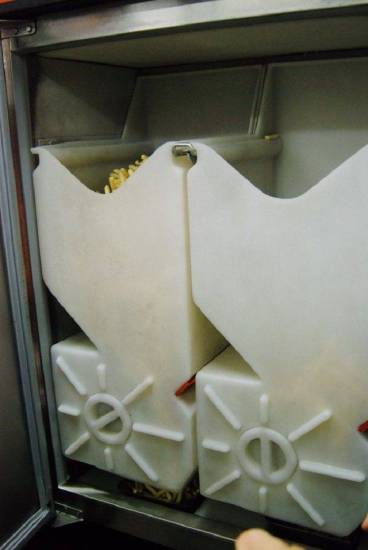Работнику достаточно поместить корзинку до конца в нужный отсек, при этом происходит нажатие кнопки-датчика и картофель моментально дозируется в корзинку и готов к жарке.
