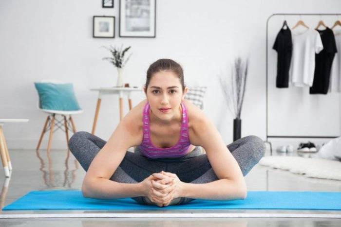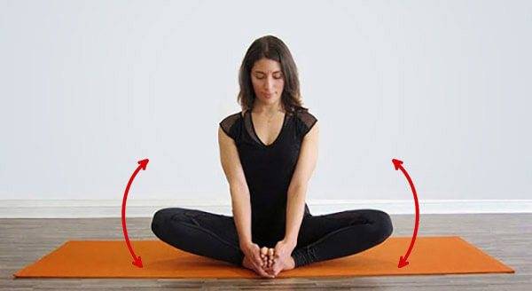 - Сведите стопы вместе друг к другу, подтяните их как можно ближе к паховой области.