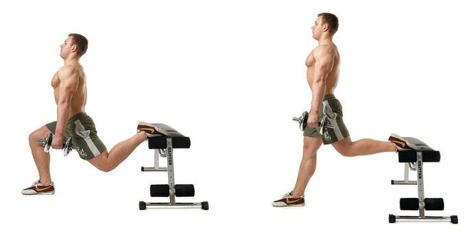 Усложненная версия выпадов, когда задняя нога опирается на возвышенность. Упражнение хорошо тем, что включает в работу мышцы-стабилизаторы для сохранения равновесия. Является одним из лучших (особенно, с весом собственного тела) для развития ягодиц.