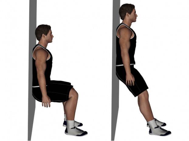 - Плотно прижимаемся спиной к стене, отступаем от неё ногами и садимся на невидимый «стул»;