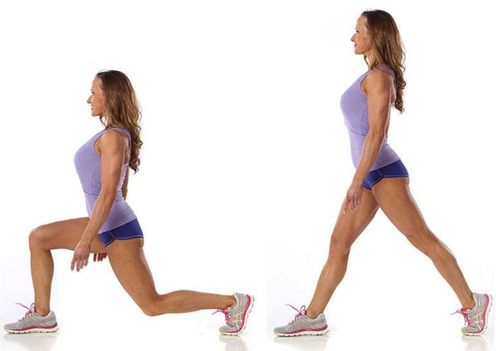 - Делаем одной ногой шаг назад. Сгибаем ноги в коленях и опускаемся вниз, до тех пока задняя нога не окажется под углом в 90 градусов.