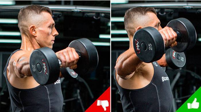 О правильном выборе «дистанции» свидетельствует более затрудненный процесс подъема гантелей, когда нагрузка приходится именно на средние пучки. Главное, правильно подобрать вес. Если он слишком тяжелый, вероятность получения травмы многократно возрастает.