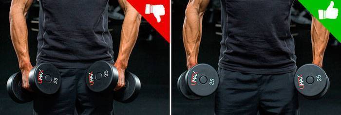 Сокращение и приведение локтей в действие приводит к балансировке трицепсов. Это лишает махи руками стоя с гантелями статуса изолированного упражнения. Оно перестает служить той цели, с которой включается в тренировочный процесс.