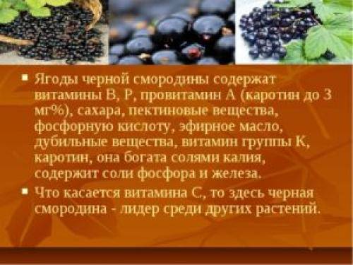 Черная смородина ( род растений из семейства Крыжовниковые (Grossulariaceae) порядка двудольных цветковых растений Камнеломкоцветные ) содержит, помимо витаминов и минералов, дубильные вещества, фруктозу, эфирные масла, глюкозу.