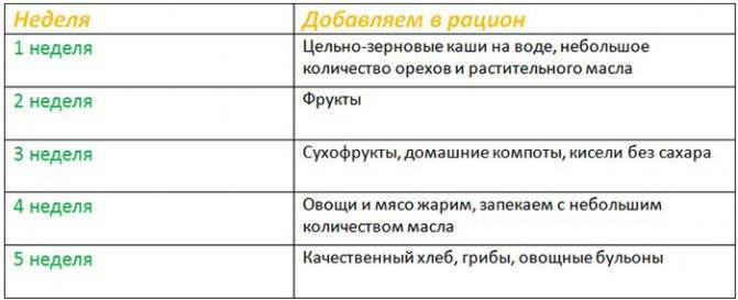 В последние три недели, отведенные на выход из диеты, вам разрешается заменять молочные продукты мясными и рыбными, добавлять в рацион легкие овощные и мясные бульоны. Обезжиренные молочные продукты можно постепенно заменять обычными. Разрешается заменить яблоки на другие виды фруктов, постепенно ввести в рацион сухофрукты. В период выхода из диеты желательно воздержаться от макаронных изделий, хлебобулочных изделий, картофеля, риса, полуфабрикатов.