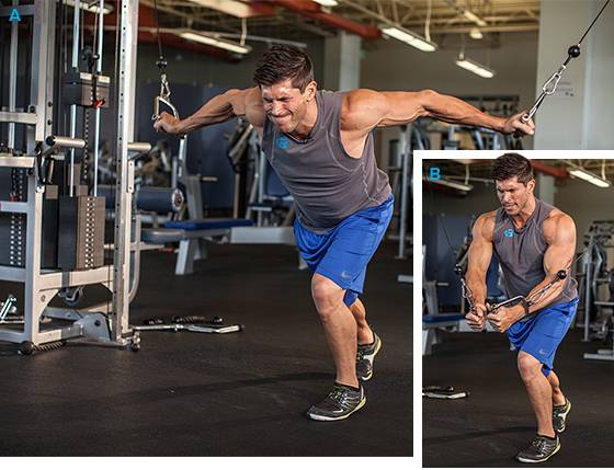 – Спина. Сначала делайте тягу штанги в наклоне, после чего переходите к тяге верхнего блока вниз.