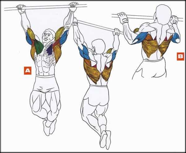 Такое распределение нагрузки должно ориентироваться на ширину хвата. Различают супинированный хват – это тот, который снизу перекладины, и пронированный – тот, который сверху перекладины, а по ширине различают – узкий, широкий и средний. Узкий хват задействует мышцы рук, плечевого отсека и груди, а широкий хват позволяет наращивать мышцы спины.