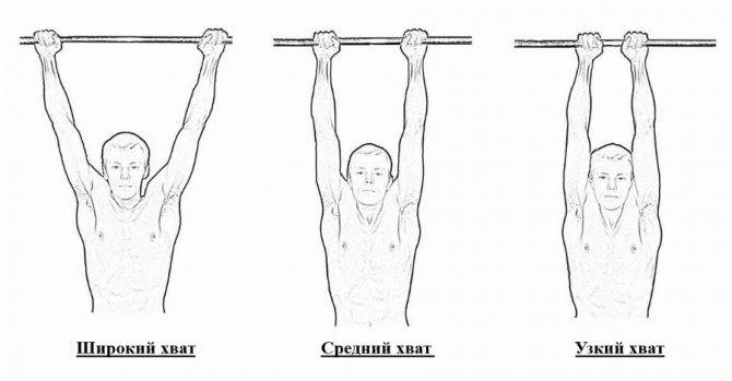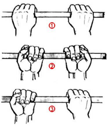 » Прямой. Обхватите перекладину так, чтобы большой палец оказался кнаружи. » Обратный. Обхватите перекладину так, чтобы большой палец оказался кнаружи. » Разноименный (разнохват). Пальцами одной руки обхватите перекладину прямым хватом, а другой — обратным.