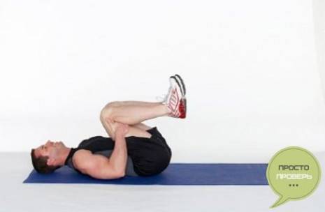 - Лежа на спине, обхватите ногу обеими руками и постарайтесь подтянуть ее к голове. При этом одновременно приподнимите голову и попробуйте дотянуться подбородком до груди. То же самое проделайте с другой ногой.