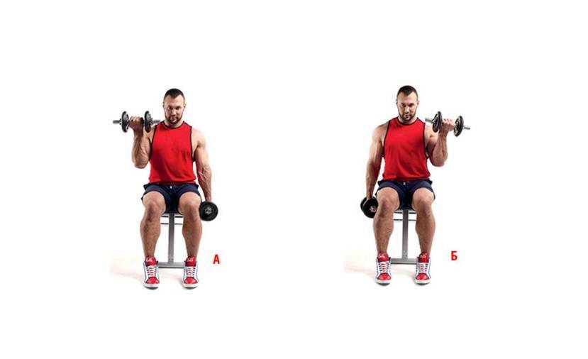 - Исходное положение: сидя на скамье или табурете, спина прямая, руки согнуты в локтях, локти прижаты к туловищу, кисти на уровне груди. В каждой руке по гантели.