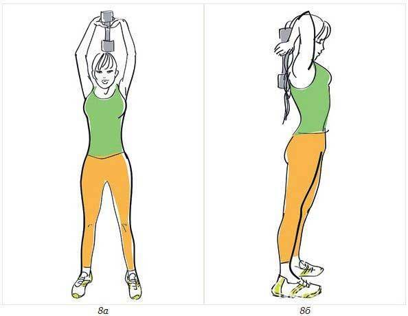- Исходное положение: стоя, ноги на ширине плеч, спина прямая, руки, чуть согнутые в локтях, подняты над головой и держат гантель, зажимая её в замок из пальцев.