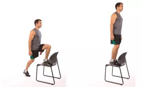 Присядьте и обопритесь о нее руками. Следите за своей осанкой, нельзя сутулиться. Отожмитесь от поверхности до того пока не образуется прямой угол между голенью и бедром. Снова присядьте.