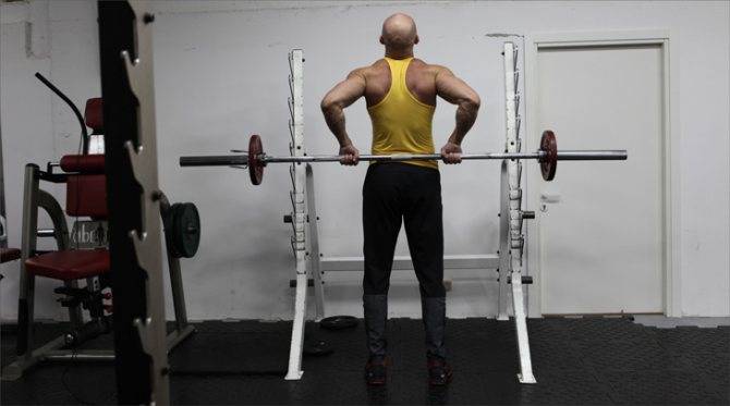 - Берется за гриф прямым хватом (ладони смотрят назад) чуть шире плеч.