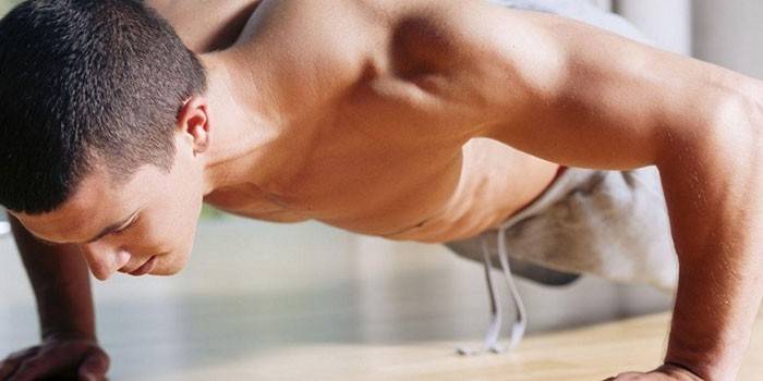 Упражнение подходит для домашнего тренинга. Регулярно выполняя отжимания, мужчина сможет быстро согнать жир с грудных мышц.