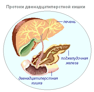 В начальный отдел тонкого кишечника — двенадцатипёрстную кишку — открываются выводные протоки двух крупных пищеварительных желёз — поджелудочной железы и печени. Здесь происходит наиболее интенсивное переваривание пищевой кашицы, которая подвергается действию трёх пищеварительных соков: поджелудочного, желчи и кишечного.