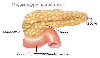 Поджелудочная железа расположена позади желудка. В ней различают верхушку, тело и хвост. Верхушка железы окружена подковообразно двенадцатипёрстной кишкой, а хвост прилегает к селезёнке.