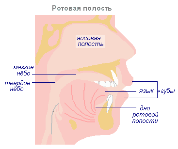 Ротовая полость — начальный отдел пищеварительного тракта. Сверху она ограничена твёрдым и мягким нёбом, снизу диафрагмой рта, а спереди и с боков — зубами и дёснами.