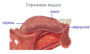 Большая часть ротовой полости занята языком , который представляет собой мышечный орган, покрытый слизистой оболочкой. В нём различают верхушку, корень, тело и спинку, на которой находятся вкусовые рецепторы. Язык — орган вкуса и речи. С его помощью пища перемешивается во время пережёвывания и проталкивается при глотании.