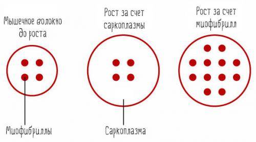 - Миофибриллы внутри каждой клетки окружает жидкая питательная среда — саркоплазма. Она накапливает и поставляет им энергию для работы. Саркоплазма тоже может увеличиваться в объеме, как бы раздувая клетку изнутри и делая мышцы визуально больше.