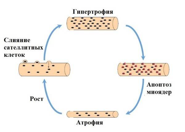 Согласно традиционным представлениям, при мышечной атрофии белковый синтез ослабевает, протеолиз набирает силу, и мышечные волокна уменьшаются в размерах, при этом происходит избирательный апоптоз лишних миоядер внутри живого волокна. Их количество регулируется таким образом, чтобы объем цитоплазмы, приходящейся на одно ядро, был всегда постоянным (рис. 2). Согласно этой модели, выросшее, а потом атрофировавшееся мышечное волокно неотличимо от волокна, которое никогда не тренировали. Такая модель не предполагает наличия мышечной памяти.