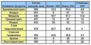 Калорийность ореховых плодов, таблица пищевой ценности, содержание БЖУ