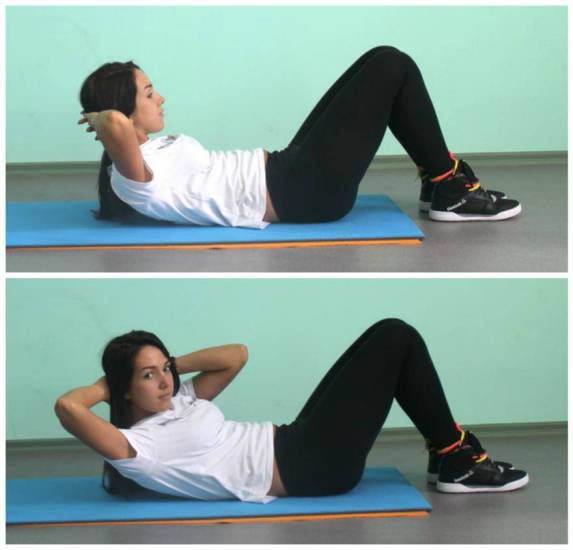 Простое упражнение усложняется за счет приподнятых ног, таз важно хорошо зафиксировать на поверхности пола и стараться не отрывать его при повторах тренинга 25 раз; велосипед. Традиционное упражнение дополняется подтягиванием корпуса вверх, при этом по диагонали соединяются колено и локоть с повторением 25-30 раз; полубанан