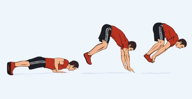Это движение похоже на описанное в пункте 5 предыдущего раздела. Отличие заключается в том, что в данном варианте нужно оттолкнуться руками, но при этом оторвать от пола не только ладони, но и носки ног. Приземлиться вы должны в то же положение, в котором находились изначально.