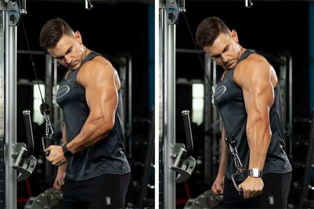 Разгибание обратным хватом позволяет вам сфокусироваться на медиальной головке трицепса. Старайтесь поддерживать максимальное напряжение в мышце, чтобы внутренняя головка выполнила больше работы. Для поддержания постоянного усилия упражнения на блоках подходят лучше всего, а за счет выполнения разгибания одной рукой вы сможете сфокусироваться на каждой руке отдельно. Также это упражнение помогает разогреть локтевые суставы перед остальной тренировкой.