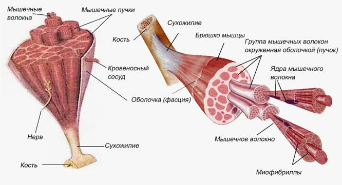Образно говоря мышечное волокно – это длинный цилиндрик (местами достигает четырнадцати сантиметров в длину) с заостренными краями. Эти цилиндрики упакованы в фасции – своеобразный чехол. Во время напряжения мышечные волокна сокращаются. Но не все волокна задействуются одновременно, таким образом, регулируется сила и скорость сокращения.