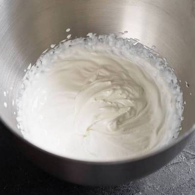 Постепенно вливаем холодные сливки жирностью 33-35% и работаем миксером до полного объединения и кремовой структуры.