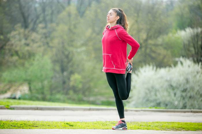 Растягивание мышц бедер. Ногу нужно согнуть в колене, поднять стопу до уровня ягодиц