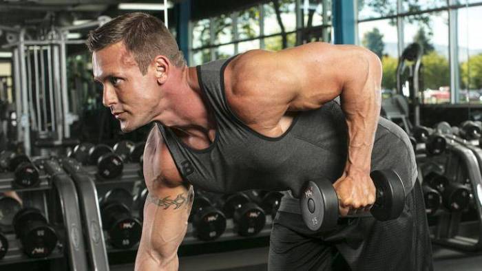 - Тяга гантелей стоя в наклоне – 3 по 12 повторов.