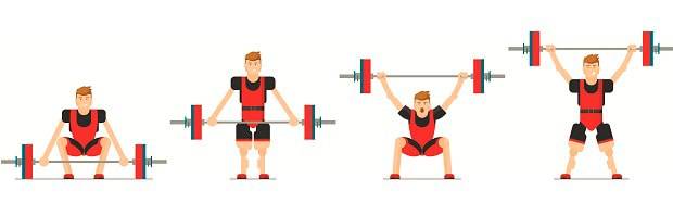 1. После захвата грифа спортсмен почти полностью выпрямляет ноги, таз поднимает вверх, тулови-