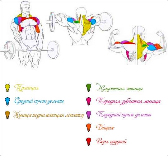Помимо «дельт», значительную нагрузку получает трапециевидная мышца, находящаяся в верхней части спины. Кстати, именно для нее это упражнение является гораздо более полезным: для плеч существует и так достаточно других способов развития мышц, а вот для трапеции список довольно скудный.