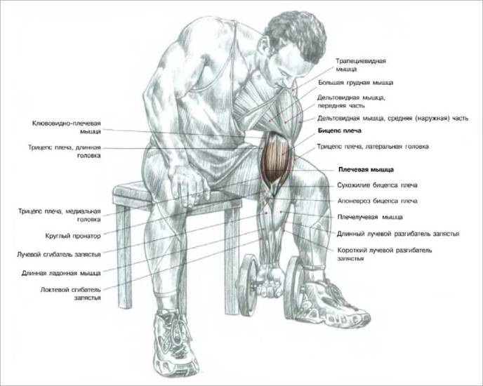 - Двуглавая мышца, то есть бицепс. Это целевой мускул, который совершает практически всю работу по поднятию гантели. Изолированная нагрузка способствует формированию объемного пика бицепса, прорабатываются сразу обе головки.