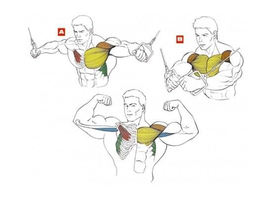 Это упражнение в кроссовере является высокоэффективным для проработки грудных мышц. Техника хорошо прорабатывает низ большой грудной мышцы и внутреннюю ее часть. Перемещая корпус и изменяя вектор движения рук, можно изменить акцент на другие части грудных мышц.