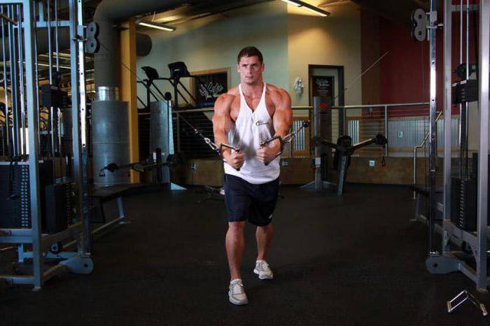 Блоки над головой. Обычно никто этого не обсуждает. У подавляющего большинства блочных тренажеров есть возможность регулировать положение блока. В любом случае, постарайтесь убедиться, что блоки находятся над плечами (желательно над головой). Тогда при наклоне верхней половины туловища, грудная мышца натягивается вперед и вниз.