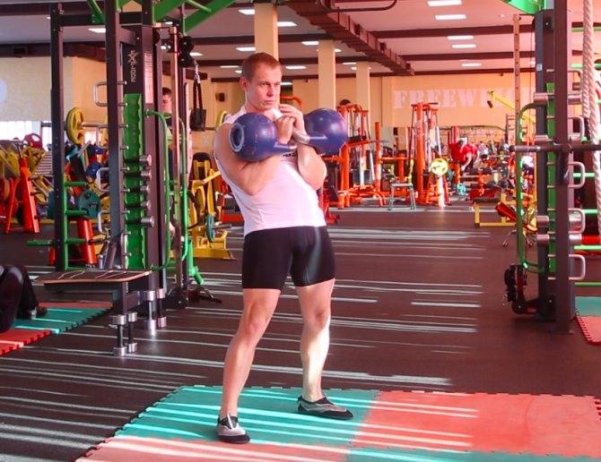 И.П.: ноги чуть шире плеч, гири в перёд 20–30 см, ручками продольно. Присесть, хватом сверху взяться за ручки гирь. Приподнять гири и послать их назад между ногами. Используя возвратное движение гирь, резко выпрямляя ноги, туловище и сгибая руки, поднять гири к плечам. Положить на плечи ручками вперёд. Присесть, а затем выпрямиться. Приседая – выдох, выпрямляясь – вдох. Темп медленный и средний. Сделать 3 х (8–10раз.). Отдых между подходами 2-3 мин.