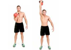 Толчок гири одной рукой. Это упражнение отлично подойдет новичкам, поскольку обладает самой просто техникой выполнения, но в котором также задействуются дельты и трапециевидные мышцы.