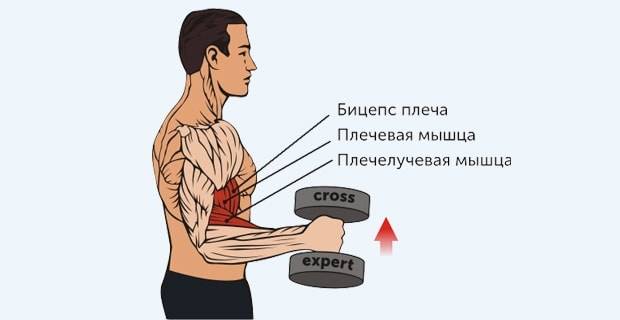 Как уже говорилось, это упражнение в первую очередь нацелено на плечевую мышцу. Также работает плечелучевая — это крупнейшая мышца предплечья.