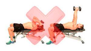 . В погоне за большими мускулами начинающие атлеты берут слишком тяжелые гантели. Из-за этого нарушается техника выполнения упражнения. - Отягощения поднимаются или опускаются с рывками, раскачиваниями, толчками корпуса