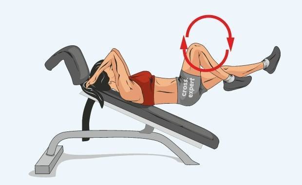 Если Вы занимаетесь в тренажерном зале, наверняка он оборудован специальным тренажером для проработки пресса, представляющим собой наклонную скамью с валиками и небольшой поверхностью для крепления рук в верхней части. Этот тренажер отлично подойдет для выполнения упражнения велосипед. Для этого нужно расположиться на нем вверх головой, поднять полусогнутые ноги и выполнять имитацию кручения педалей без подключения корпуса и локтей, держась руками за «штырь» в верхней части тренажера. Принципиальная особенность этой разновидности упражнения заключается в том, что за счет небольшого угла, заданного тренажером, мы создаем небольшую дополнительную статическую нагрузку на нижний отдел пресса.
