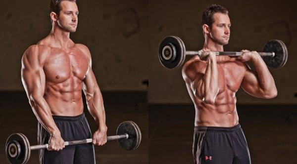 - № 1. Руки сгибают обратным хватом, используя прямой или изогнутый гриф. Повторов – 10, подходов – 5, перерыв между подходами – 10 секунд.