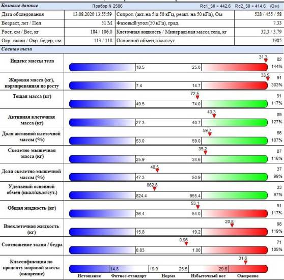 В нашей клинике вы также можете узнать более подробно о составе своего тела и состоянии сосудистой системы, которая участвует в кровоснабжении внутренних органов, скелетно- мышечной мускулатуры, головного мозга.. Наши опытные доктора подробно разъяснят Вам полученные данные. Биоимпендансометрия высчитывает соотношение жира, мышечной , костной и скелетной массы, общей жидкости в организме, скорости основного обмена. От состояния мышечной массы зависит интенсивность рекомендуемой физической нагрузки. Обменные процессы в свою очередь влияют на способность организма восстанавливаться. По показателям активной клеточной массы можно судить об уровне физической активности и сбалансированности питания. Это простое и быстрое в проведении исследование помогает нам увидеть нарушения в эндокринной системе и принять необходимые меры
