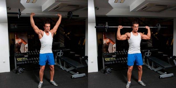 Это движение бодибилдеры выполняют так, чтобы плечо было на уровне плоскости, параллельной полу. Опускать ниже не рекомендуется, чтобы не получить травму. В тяжелой атлетике движение начинается с верха трапеций, то есть атлет кладет штангу на верх трапеции, и выжимает каждый раз на прямые руки.