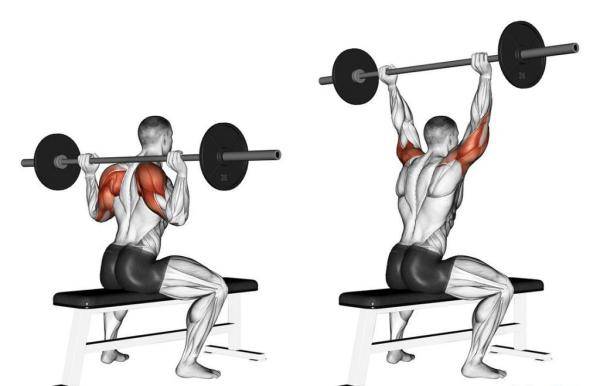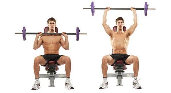 Поднятие из-за головы в положении «сидя» позволяет хорошо проработать средние и верхние пучки дельт. Выполнять такой вариант могут себе позволить только опытные атлеты в силу высокой травмоопасности. Задание отличается от других вариаций более широким хватом рук.