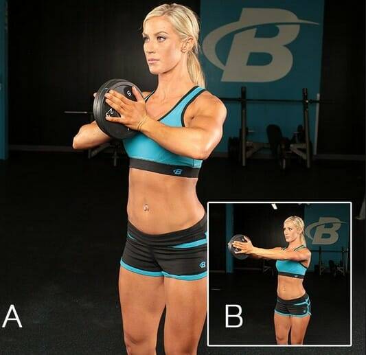 Начинать работу необходимо со снарядами небольшого веса, чтобы привыкнуть к движению и научиться чувствовать работу мышц в нем – с пары блинов по 1 килограмму, далее увеличивая вес дисков или их количество.